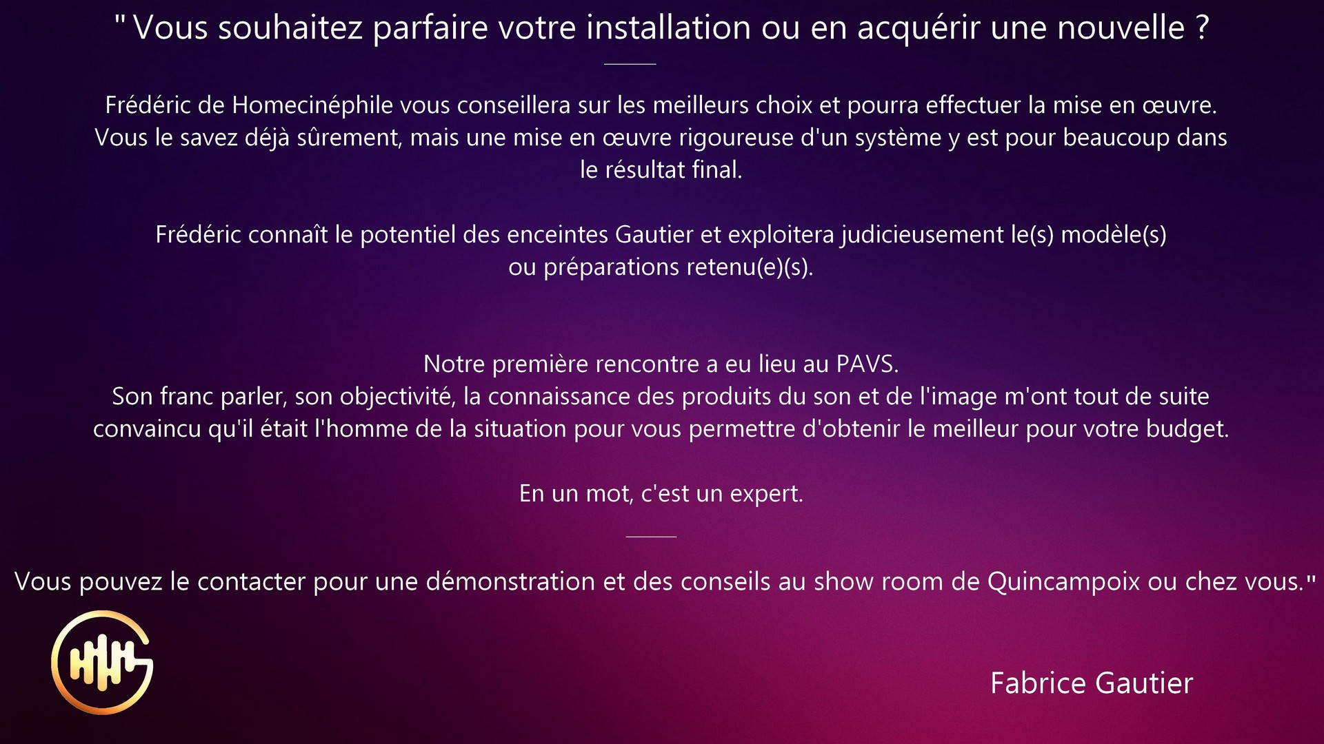 Enceintes 100% Gautier: Un réalisme parfait. Allier douceur et précison, telle est notre volonté.