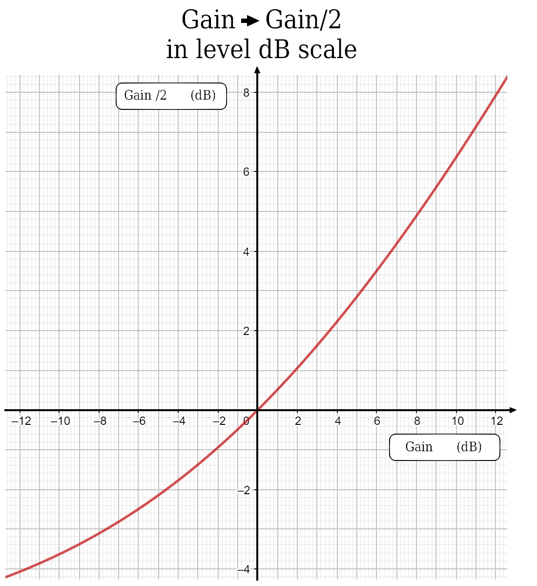 Maintenant que vous avez fait vos corrections à la mesure, divisez les par 2 ! Est-ce que vous avez perdu quelque-chose en divisant les coefficients de correction par 2 ? Sincèrement ? Il y a des chances que non, surtout pour des écoutes à volume modéré. Voici comment diviser un gain un niveau par 2 (en dB).