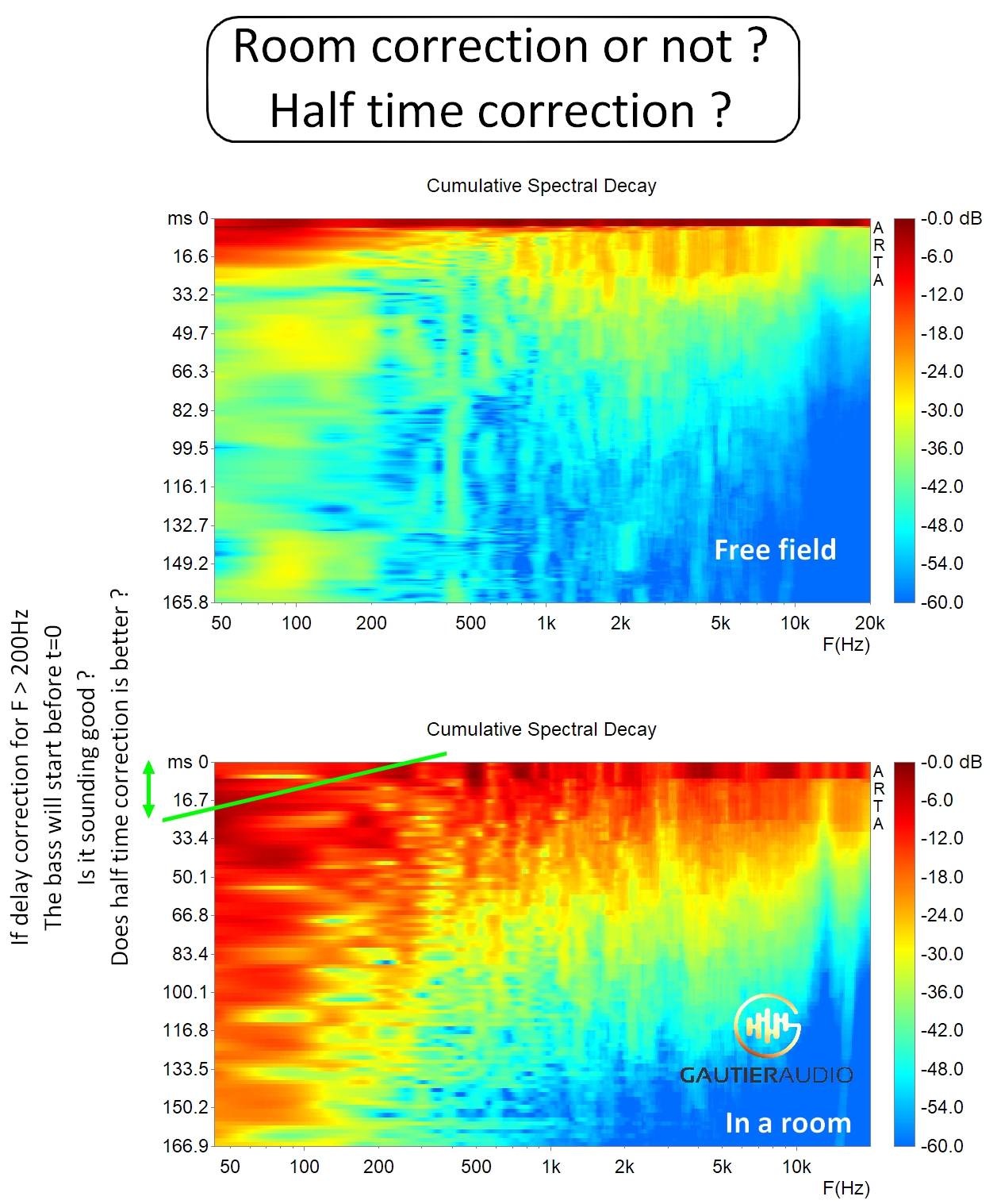 Faut-il caler tous les maximums de chaque fréquence à un instant t ? Au risque d'avoir une partie du grave qui arrive trop tôt ? Le problème est que le grave met un certain temps à s'instaurer dans une pièce. Donc si vous prenez comme point si vous délayez pour avoir le pic de grave calé sur le reste, vous aurez une partie du grave (certes atténuée) qui arrivera en avance. Là encore, il faudra trouver un compromis. Un décalage de temps de la moitié du temps "idéal" peut être un bon compromis.