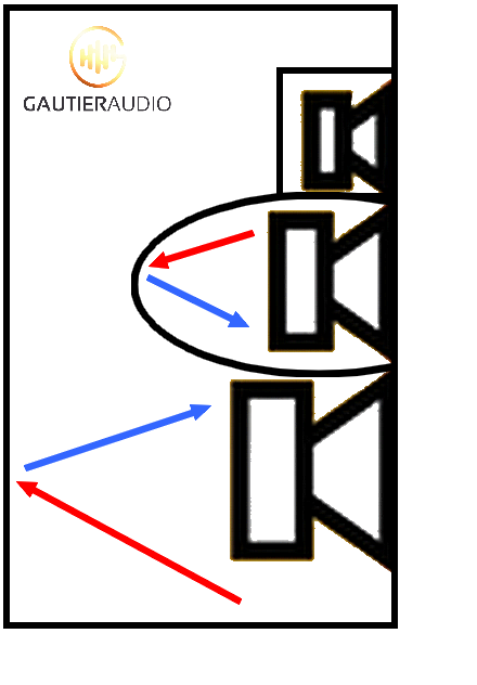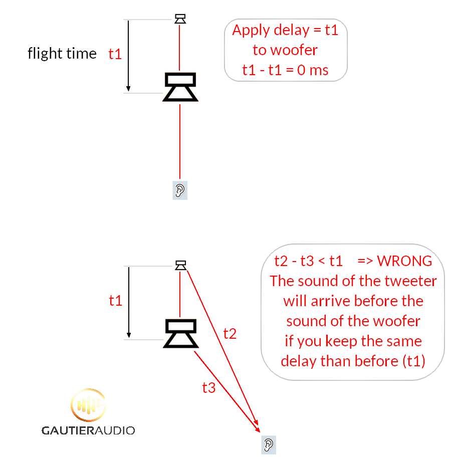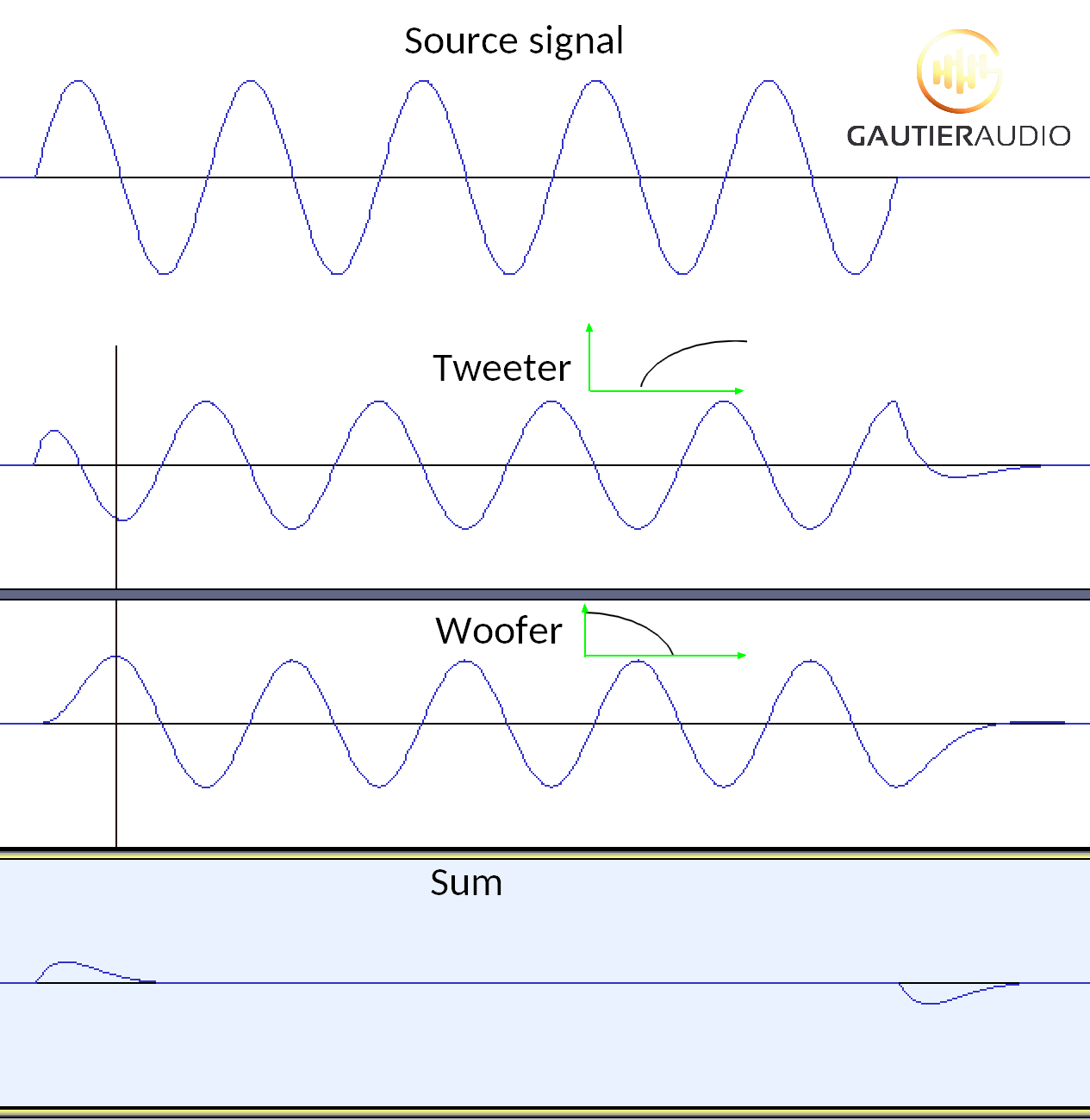 On remarque que lorsqu’on est plus dans l’axe (vertical surtout), l’éloignement entre le tweeter et le médium par rapport à notre oreille est réduit. Le délai apporté sur le signal électrique du médium pour que le son du tweeter arrive en même temps que celui du médium ne sera plus le bon. La réponse en fréquence hors axe aura des irrégularités car les phases relatives ne seront plus respectées.