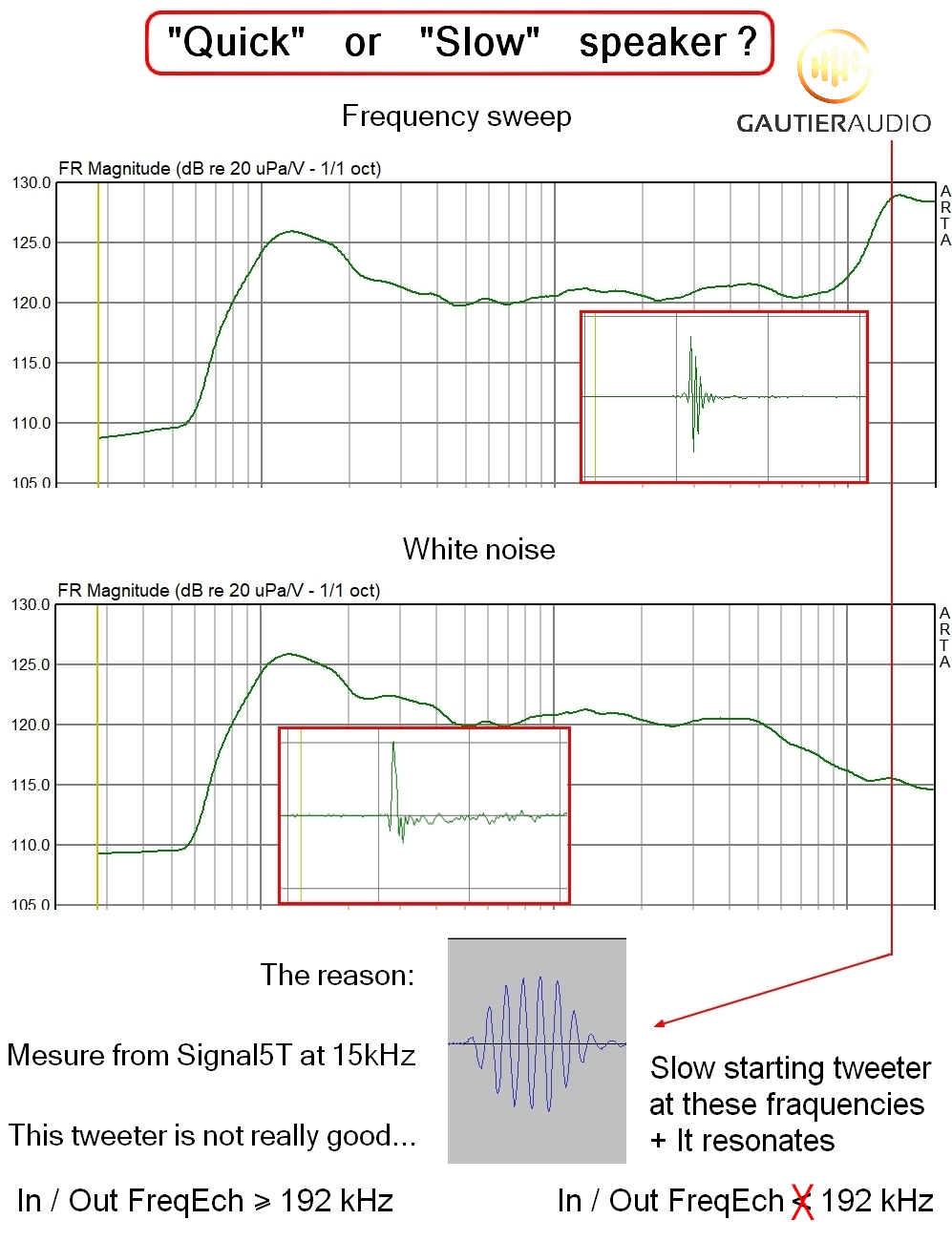 Vous pouvez faire une mesure calculée sur un bruit blanc, et une autre calculée sur un frequency sweep. Vous comparez les 2. La première vous donne une idée du comportement sur les transitoires et la 2ème sur le comportemen ten régime établi. Logiquement, les 2 courbes des 2 types de mesure devraient être proches et linéaires en champ proche du bas médium à l’aigu. Dans la réalité, il en est autrement, car les transducteurs ne sont pas aussi « rapides » pour l’ensemble des fréquences, ça sera l’objet d’une grande partie de cette méthode.