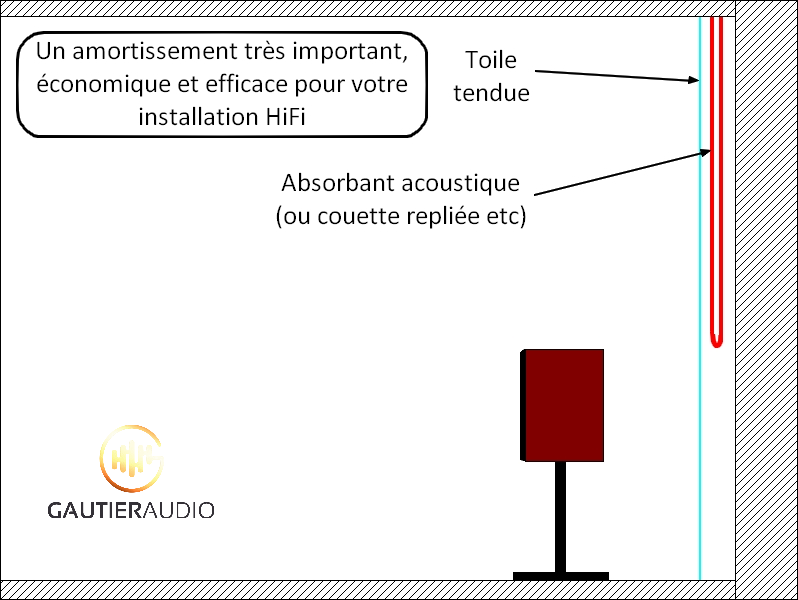 Insonoriser le mur frontal sur sa demi partie supérieure donne de bons résultats à l’écoute sur l’image sonore, surtout si vos enceintes sont proches du mur frontal.