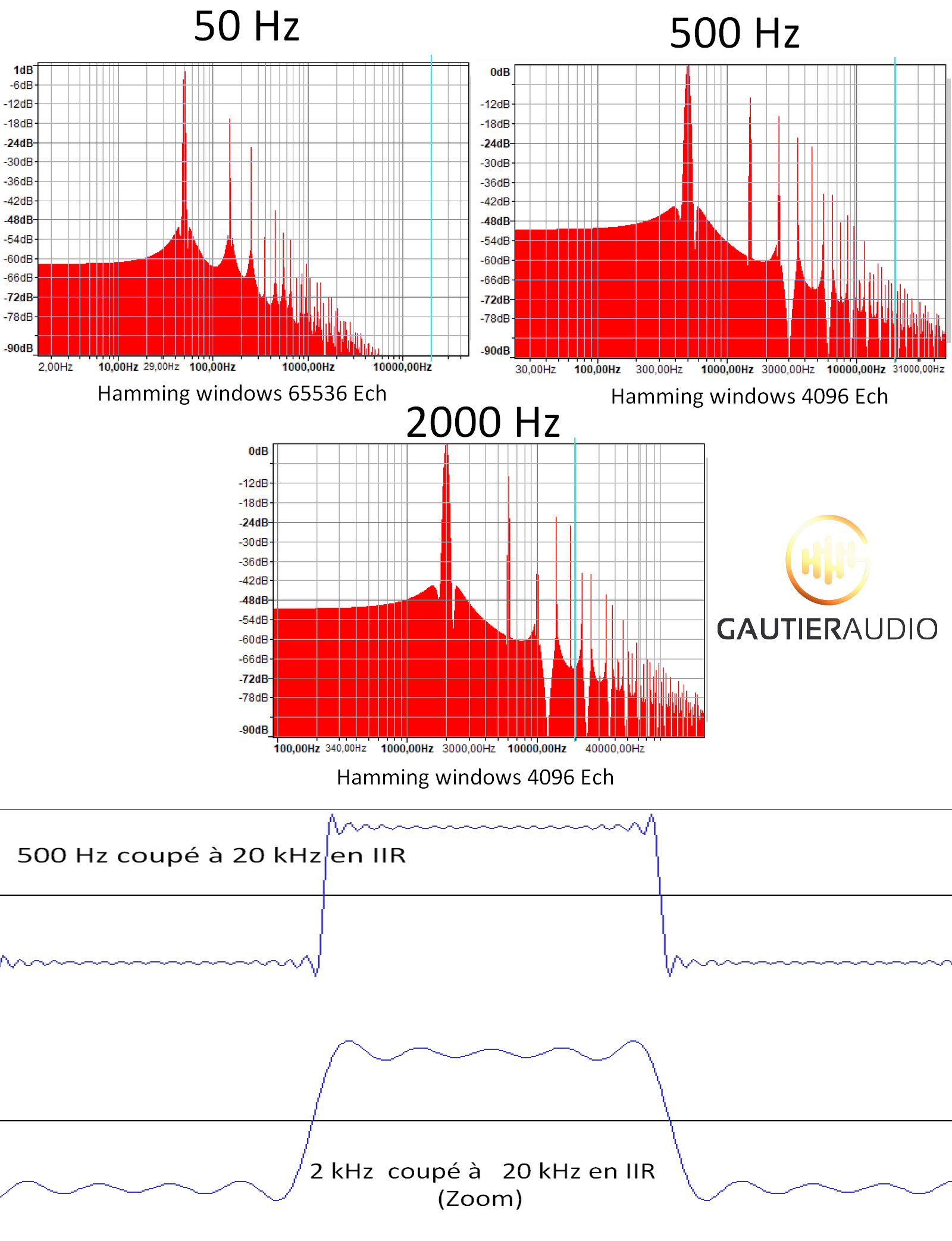 N'essayez pas d'obtenir un signal carré parfait avec votre système (amplificateur, enceinte...), les harmoniques supérieures à 20 kHz sont inaudibles et donc inutiles. Conclusion, voici à quoi peut ressembler votre signal mesuré, tout en étant totalement fidèle. Plusieurs cas représentés: spectre d'un signal carré à 50Hz, et d'un signal carré à 500Hz, puis ce que donne un signal carré à 500Hz ou à 2KHz lorsqu'on coupe les fréquences supérieures à 20kHz. Un signal audio parfait à l'écoute, donc.